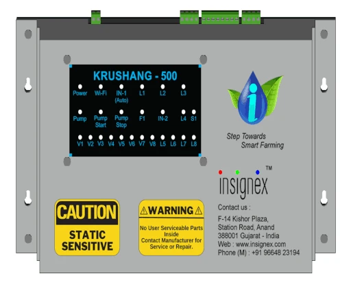 Krushang-500: cloud-enabled irrigation controller, mobile app scheduling/monitoring, improves yield, profitability, reduces overhead.